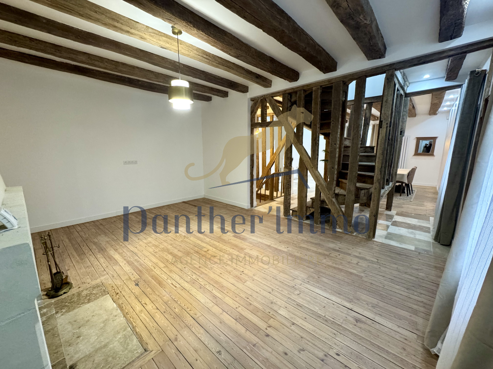 Espaces de vie : Un vaste séjour de 65 m² sublimé par des poutres aérogommées et un balconnet parisien.